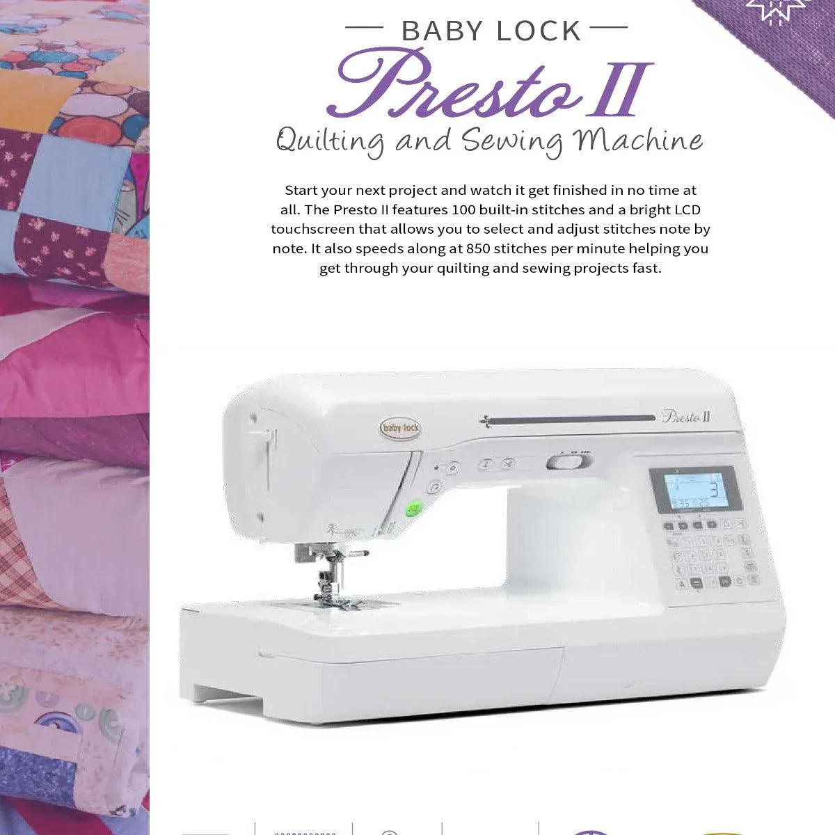 Experience precision, speed, and ease with the Baby Lock Presto II—a sewing and quilting machine designed to help you bring your projects to life effortlessly. With 100 built-in stitches, including utility, decorative, and stretch stitches, you’ll have endless creative possibilities at your fingertips. Whether you’re piecing a quilt or working on garment construction, the 850 stitches-per-minute speed ensures you can complete projects quickly without compromising accuracy.