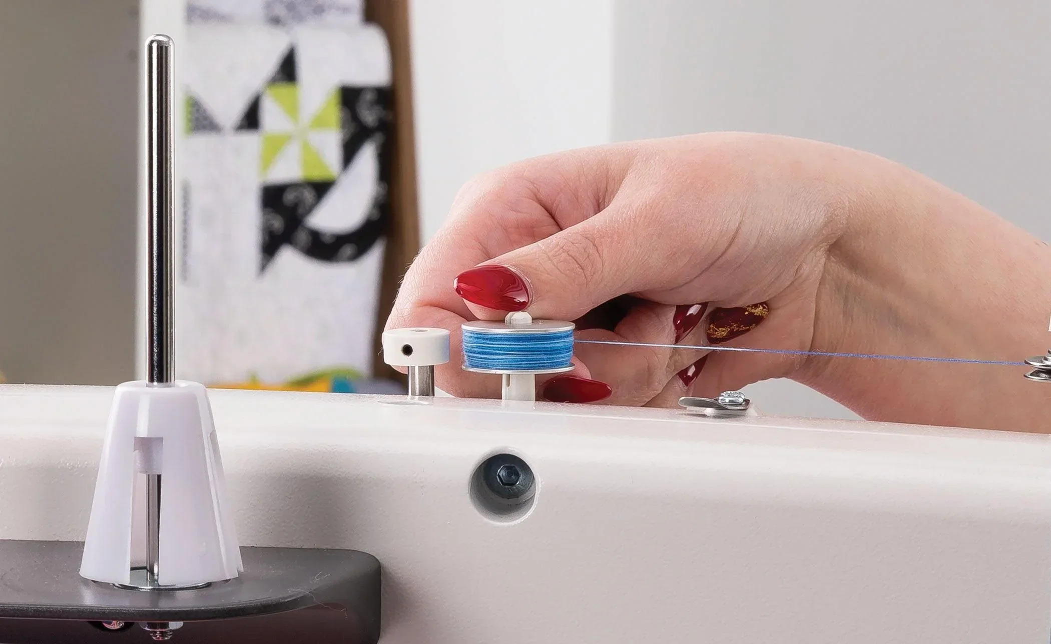 Unlike other long and midarm machines, the 21X Elite has a built-in bobbin winder to quickly wind your large M-Style bobbins. The machine’s bobbin cam is set so the bobbin will wind completely before the winder shuts off. For best results when winding a bobbin, Grace recommends 50-weight polyester thread on a cone.